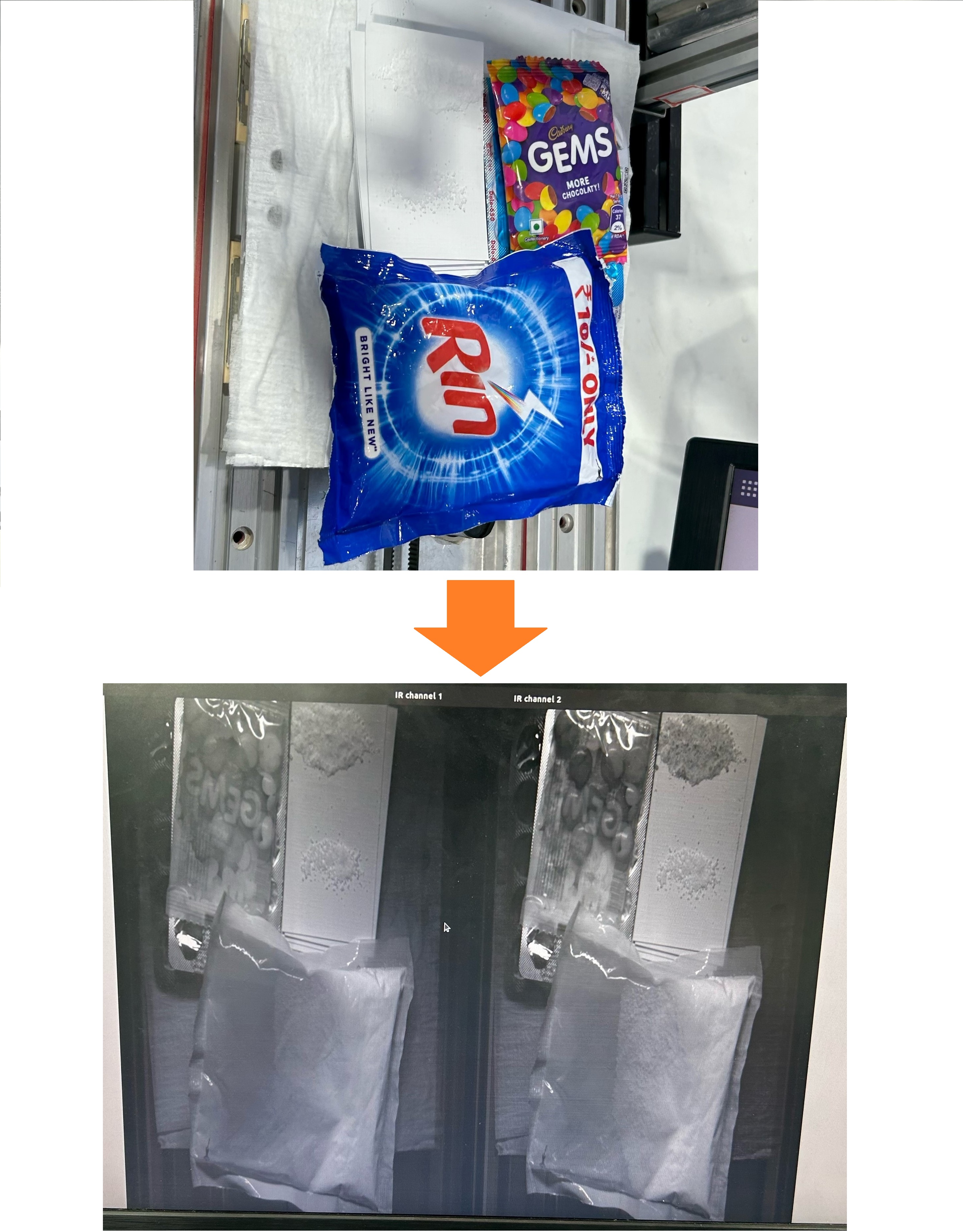 You can recognize the contents of the packages, transmitting their plastic bags. Also, by using 2 SWIR wavelengths, you can see the difference of the materials well which are difficult to recognize by visual observation.